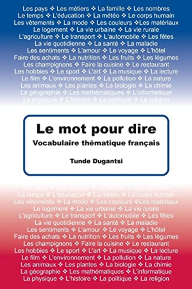 This book is a language learning tool. It presents 50 different themes and collects hundreds of French words and expressions for each theme. There is no translation in the book, as finding a word's translation may be enough to add it to the learner's passive vocabulary, therefore it's a great start for learning the word. Here is a list of the themes: communication basics, countries, professions, family, numbers, time, education, weather, description of a person, human body, clothing, colors, materials, accommodation, city life, country life, transport, cars, holidays, everyday life and social life, health and illness, feelings and love, vacation and travel, hotel, shopping, food, fruits, vegetables, cooking, restaurant, hobby, sport, art, music, books, TV and Cinema, environment and pollution, nature, animals, plants, biology, chemistry, geography, mathematics, computer, physics, history, politics, religion, useful expressions.