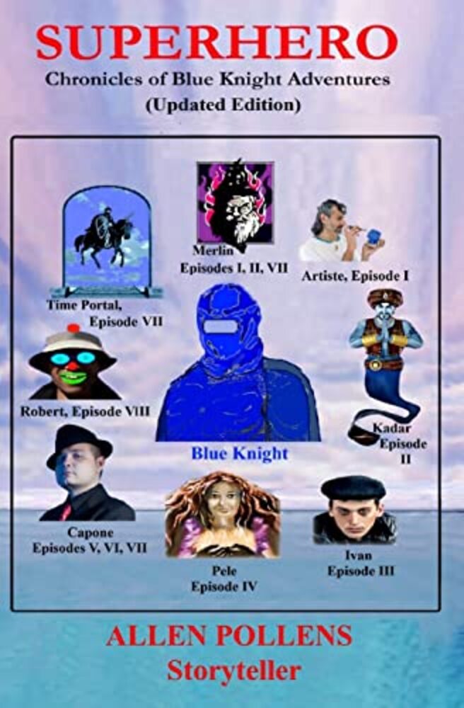 Chicago Births a Superhero Dedicated to "The Protection of Mankind, Upholding Honor and Justice, and Vanquishing Evil in All Its Forms and Wherever Found." Superheroes capture our imaginations. Superheroes inspire a purity of beliefs in positive, self-effacing conduct. Superheroes simplify the distinction between good and bad, even when circumstances are complicated. Allen Pollens responds to our adoration of the conduct of "knights of old" by recreating its essence in the present day. In SUPERHERO's eight episodes, our armored champion is challenged by an art thief (The Artiste), a Marid jinni (Kadar), a volcano goddess (Pele), a Russian Mafia boss (Ivan), a gangster committed to bringing back the glory days of Al Capone (Tony), and criminals from Seattle. Captured and held prisoner by The Artiste in the initial episode, Blue Knight dwells on how his alternate identity, Roger from Nebraska, came to Chicago to fulfill his destiny. Thus, readers are treated to the Superhero origin story. While each episode stands on its own, Roger/Blue Knight evolves with the new challenge each escapade presents. The relationships he forms with the people at Rosie's Rooming House become increasingly important, especially the one with Myra. Created by Merlin, Blue Knight has the appearance of a knight of old as he appears in Roger's dreams. However, every aspect of the knight's being and his steed, Black, contribute to his super powers. The excitement of Blue Knight's exploits as he goes forward according to his vows of conduct is heightened by the unusual and wily opponents that test him. Yet beneath it all, there is still Roger, the human side of Blue Knight, who grows from the simple young man off the farm into a principled adult with strong feelings for the people around him. Each episode is unique in the story it tells, and what it adds to our understanding of Roger and Blue Knight. However, the ongoing characters evolve with each new story. Readers may finish the eighth episode wanting more. If they do, author Allen Pollens promises sequels with more Blue Knight adventures.
